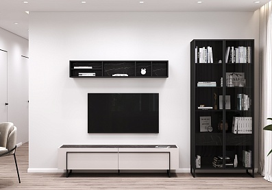 Все модули гармонично сочетаются друг с другом. Черный акцентный мрамор добавляет коллекции изысканности и роскоши, а выразительная геометрия тонких черных ручек на фасадах, перетекающая в линию опор, придают ей современный вид.
