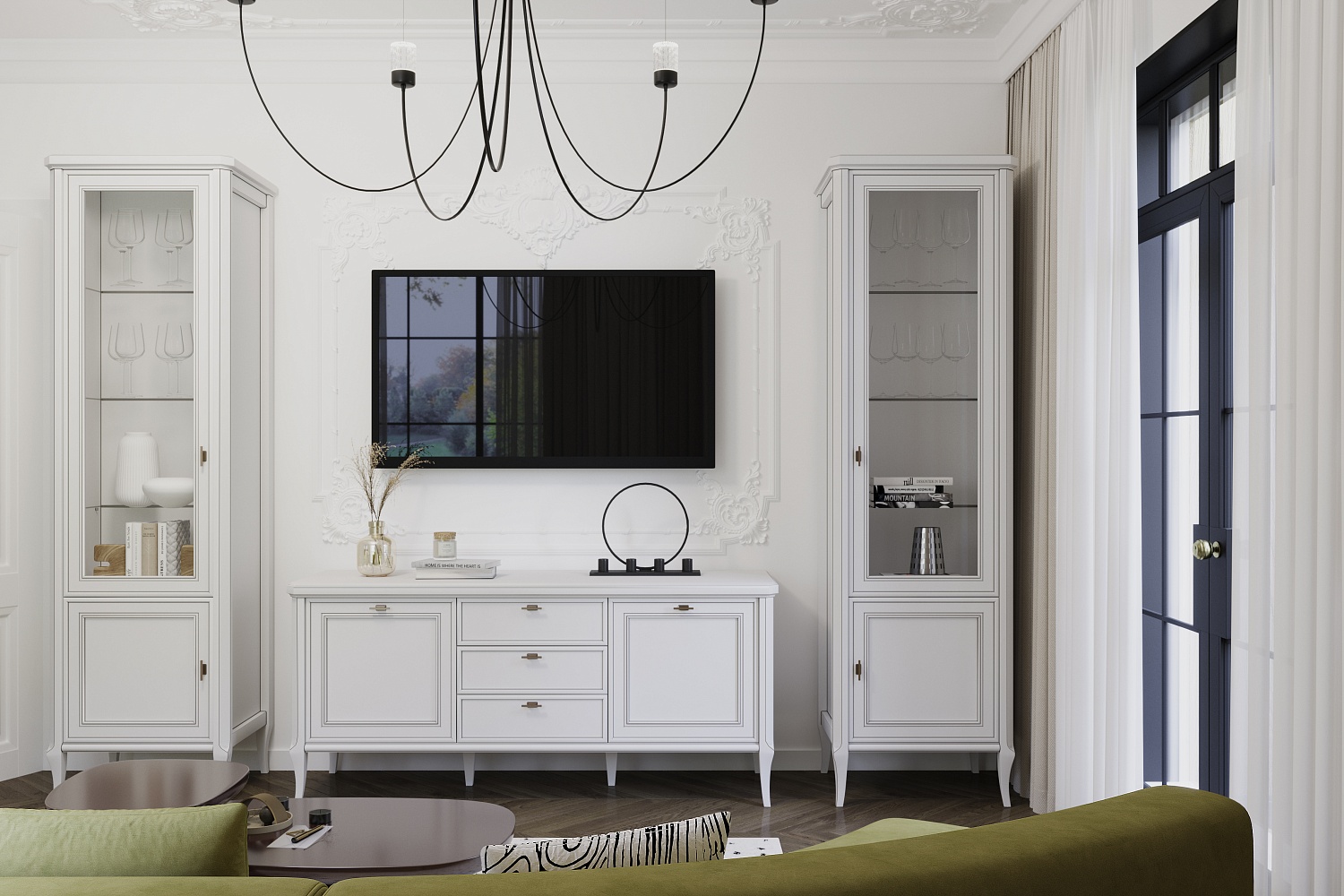 - Комод с 3 секциями: крайние секции комода — отделения с одной съемной щитовой полкой за распашными фасадами;