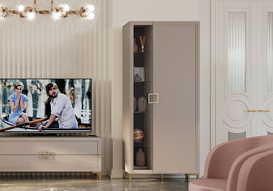 • Внутреннее наполнение: стеклополки 0,6 см за стеклянным фасадом и ЛДСП 1,6 см за глухим фасадом;